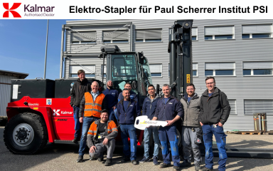 Übergabe eines neuen Kalmar Elektrostaplers ECG160-12 an das Paul Scherrer Institut PSI in der Schweiz. Der Schwerlaststapler mit 16 t Tragkraft überzeugt durch kompakte Bauweise, hohe Wendigkeit und emissionsfreien Betrieb. Ideal für Logistik und Industrie. Fahrerschulung inklusive für sicheres, effizientes Arbeiten.