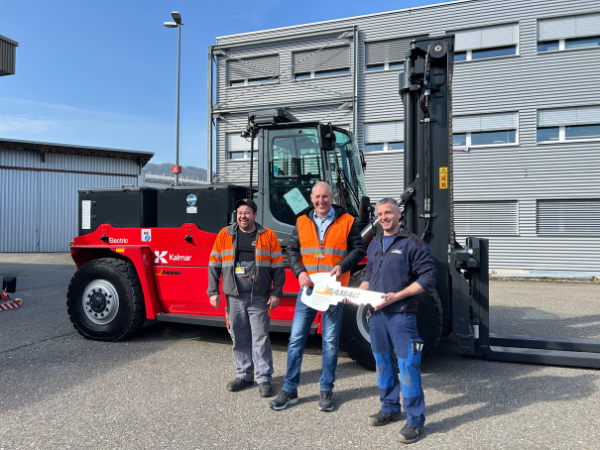 Übergabe eines neuen Kalmar Elektrostaplers ECG160-12 an das Paul Scherrer Institut PSI in der Schweiz. Der Schwerlaststapler mit 16 t Tragkraft überzeugt durch kompakte Bauweise, hohe Wendigkeit und emissionsfreien Betrieb. Ideal für Logistik und Industrie. Fahrerschulung inklusive für sicheres, effizientes Arbeiten.